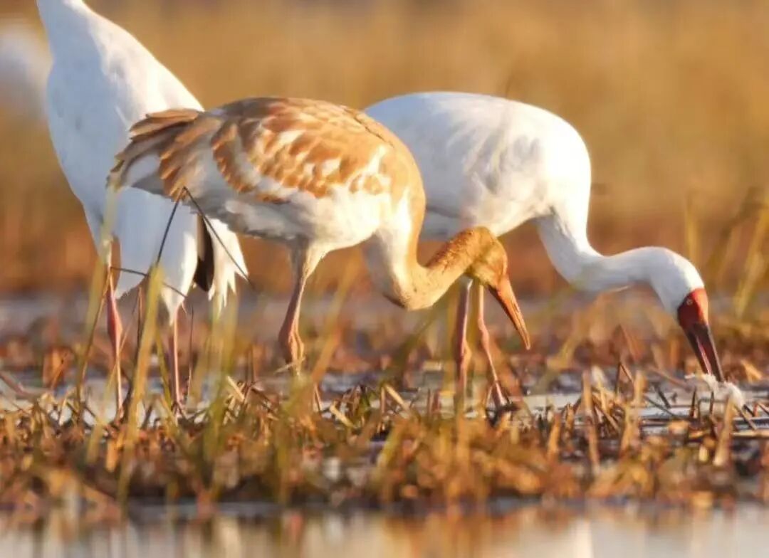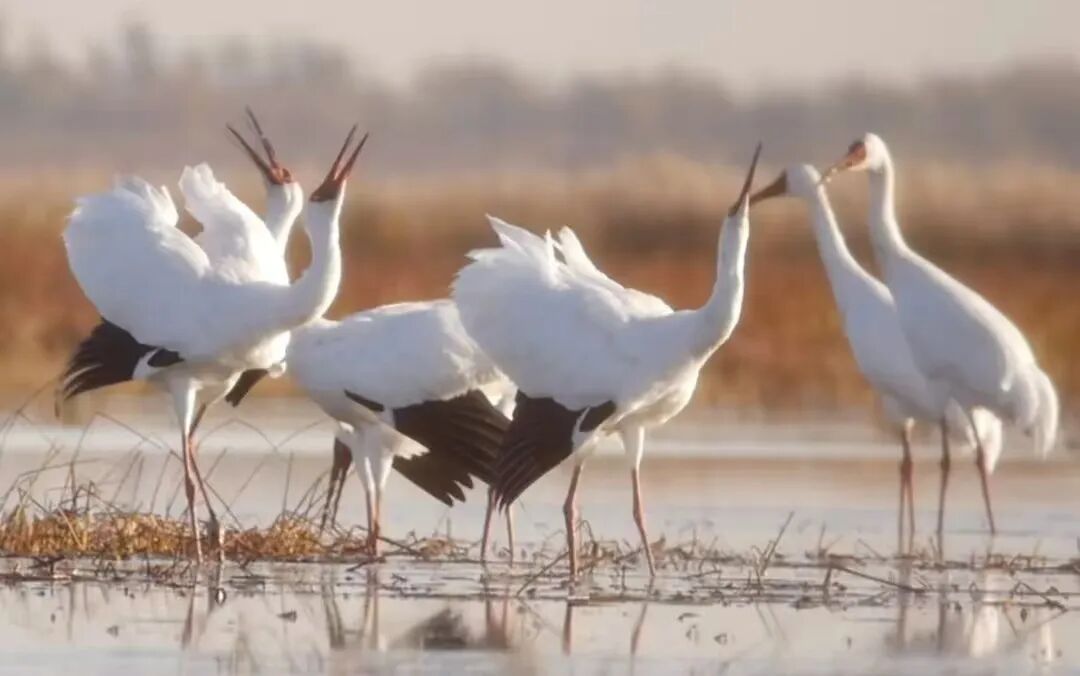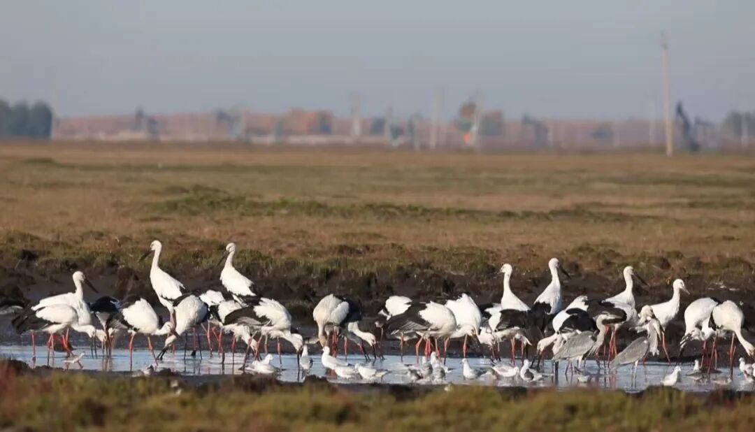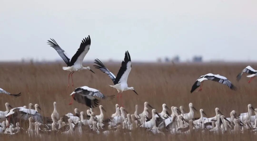 与此同时,上万只雁鸭也浩浩荡荡地加入了这场迁徙盛宴。它们排列成整齐有序的队伍,时而变换着阵形,仿佛在进行一场盛大的空中表演。而在这群灵动的身影之外,东方白鹳、白枕鹤、灰鹤、小天鹅等珍稀鸟类也相继现身在这片生机盎然的土地上,它们在澄澈的水面上轻盈掠过,又或在金黄的稻田间穿梭嬉戏。