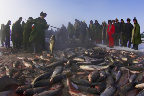 每到隆冬,这里更有绝美的冰雪盛宴。冬捕,这一古老的冰上捕鱼生产,不仅是火热的劳动场面也是特有的关东文化,更是在隆冬时节领略冰上收获的重要旅游风景。黎明时分,渔工们即开始了冰上作业,他们冒着零下二十多度的严寒,分散在数十万平方米的捕鱼区域,凿冰下网。全长1600米的大网片,经数百个冰眼在水下传递直至首尾交汇,渔网所及区域的水下鱼类便被悉数捕获。