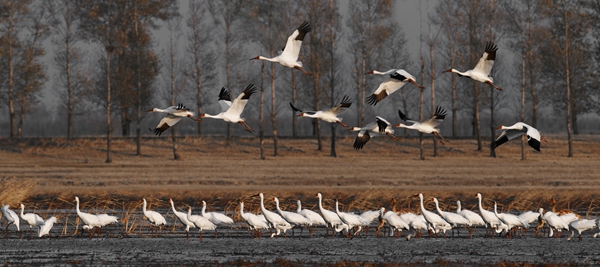 放飞场2009年正式开放,现有白枕鹤、灰鹤、蓑羽鹤、丹顶鹤近40只。在饲养员的驯养下,可以实现大规模的放飞表演,场面宏大壮观,当翩翩飞舞的仙鹤盘旋于您的头顶时,会把您久居都市,尘封已久的心情一同放飞在湛蓝的天空下,得到的不仅是心灵上的净化,更是思想上的震撼与启迪!谁想一睹仙鹤的翔姿舞态,俯瞰保护区的湿地风光,就请随我一同登上观鸟台。